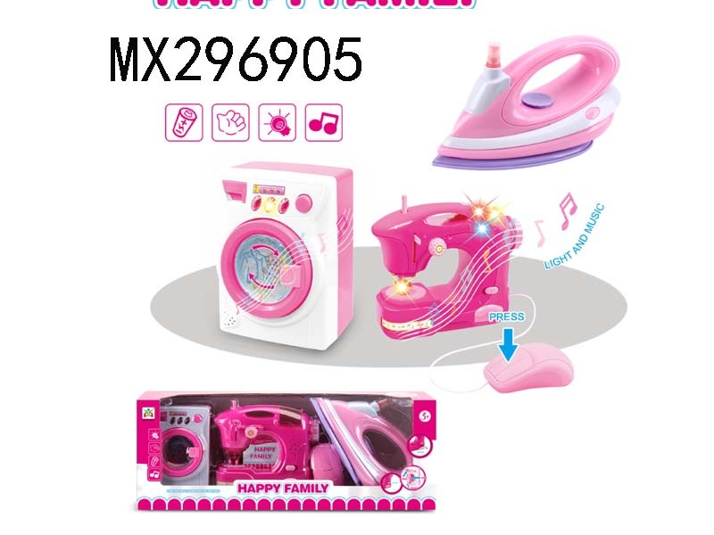 Electric iron, washing machine, sewing machine combination/vibration, water spray, lighting, music,